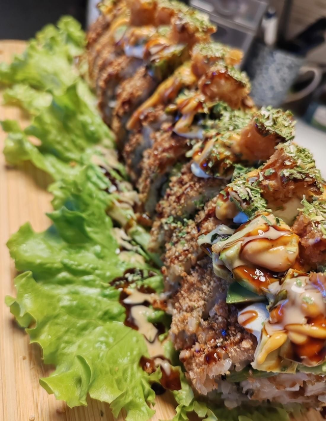 poulet, tempura, fromage ,curry ,avocat, ciboulettes ,mayo, sauce maison
